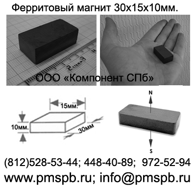 Предлагаем ферритовый магнит в форме пластины (призмы) размером 30х15х10мм. (Длина х Ширина х Толщина). Цена 12руб./1шт. Все магниты намагничены вдоль толщины. Магнитные характеристики (Br: 0.38 - 0.40 Тл.; Hcb: 230 - 275 кА/м; Hcj: 235 - 290 кА/м; BH (max): 27 - 32 кДж/м3; Диапазон рабочих t: от -60 до + 250 *C; Точка кюри t: + 450 *C) Также в наличии на складе множество магнитов разных форм и размеров из материалов NdFeB (неодим-железо-бор), SmCo (самарий-кобальт), AlNiCo (альнико), ЮНДК, феррит.