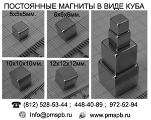 Предлагаем неодимовые (неодим-железо-бор) постоянные магниты в форме куба 5х5х5мм, 6х6х6мм, 10х10х10мм, 12х12х12мм. по очень выгодным ценам. Все магниты имеют очень большую магнитную силу. Магниты покрыты никелем, кромки куба имеют фаску. Магнитные характеристики: (Br: 1.13 - 1.17 Тл.; Hcb: 836 кА/м; Hcj: 955 кА/м; BH (max): 263 кДж/м3; Диапазон рабочих t: от -60 до + 80 *C; Точка кюри t: + 310 *C) Также в наличии на складе множество магнитов разных форм и размеров из материалов NdFeB (неодим-железо-бор), SmCo (самарий-кобальт), AlNiCo (альнико), ЮНДК, феррит. Узнать цены и получить информацию по магнитам других форм и размеров Вы можете, позвонив к нам в офис или написав письмо на электронный адрес.