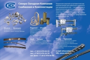 ООО «Северо-Западная Компания Снабжения и Комплектации» предлагает широкий спектр комплектующих и инструмента для кабельной, химической, пластиковой промышленности, в наличии и на заказ: 1) МЕХАНИЗМЫ UHING (Германия): раскладочные механизмы на гладкий вал, системы бесконтактного тестирования фланцев, линейные приводы «винт-гайка», быстродействующая система зажимов «easylock», зажимные элементы «U-clip»; 2) ПРОДУКЦИЯ HEINZE (Германия/США): дуги, глазки к дугам для всех крутильных машин. 3) ПРОДУКЦИЯ MOUTON(Франция): волочильные фильеры, дорн-матрицы; 4) ПРОДУКЦИЯ MANN+HUMMEL (Германия): автозагрузчики, дозаторы, оборудование для сушки 5) ПРОДУКЦИЯ JINGZHI (Китай): шнеки, цилиндры; 6) БАНДАЖНЫЕ КОЛЬЦА PAGANONI (Kersint, Kerblack, Wolside) (Италия): обода и катушки; бандажные кольца, вставки, конусы; направляющие для проволоки; 7) ПРОДУКЦИЯ SIT (Италия): профессиональные коррщетки для обработки металла.