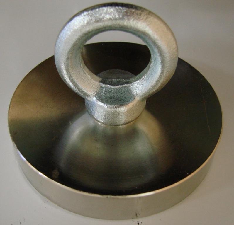 Поисковые магниты с усилим на отрыв 81кг., 113кг., 164кг., 200кг. Поисковый магнит состоит из стального стакана с креплением (резьба) под рым-болт. Внутри стакана закреплен постоянный магнит из сплава NdFeB (неодим-железо-бор). Поверхность стального стакана и самого магнита никелированы для защиты от ржавления и коррозии. Все поисковые магниты можно использовать в морской и пресной воде, а также для подъема металлических деталей из гальванических ванн и химических растворов.
