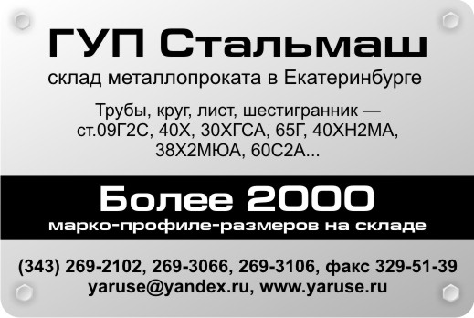 Круг ст.12Х1МФ, круг 280, круг 270, круг 260, круг 250, круг 240, круг 230, круг 220, круг 210, круг 200, круг 190, круг 180, круг 170, круг 160, круг 150, круг 140, круг 130, круг 120, круг 110, круг 105, круг 100, круг 95, круг 90, круг 85, круг 80, круг 77, круг 75, круг 73, круг 72, круг 70, круг 68, круг 65, круг 63, круг 60, круг 58, круг 56, круг 55, круг 54, круг 53, круг 52, круг 50, круг 48, круг 45, круг 44, круг 42, круг 40, круг 39, круг 38, круг 36, круг 35, круг 34, круг 33, круг 32, круг 30, круг 28, круг 27, круг 26, круг 25, круг 24, круг 23, круг 22, круг 21, круг 20, круг 18, круг 17, круг 16, круг 15, круг 14, круг 12, круг 11, круг 10. Круг ГОСТ 2590-88 круг горячекатаный, круг ГОСТ 7417-75 круг калиброванный, круг ГОСТ 14955-77 круг серебрянка (спец.отделка поверхности). Оперативная и полная информация о наличии, ценах, условиях и сроках отгрузки по телефонам ГП Стальмаш:Тел./факс (343) 269-30-66,269-31-06,372-36-55 email: dmit.bat@yandex.ru URL: www.yaruse.ru